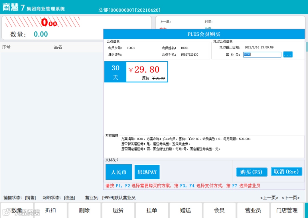 当PLUS会员使用优惠券、会员价消费时,收银员可通过输入会员号或手机号,在支付界面点击“PLUS会员购买”快捷方式,自动带出会员优惠券信息列表选择并收款。
