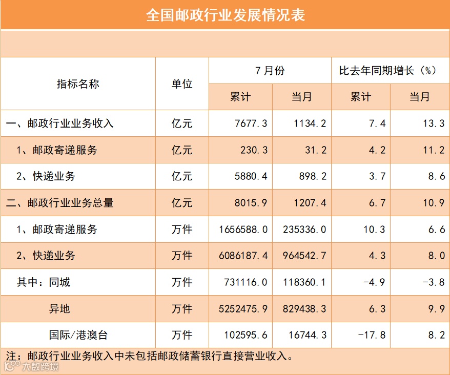 7月份,邮政服务业务总量完成156.4亿元,同比增长5.2%;邮政寄递服务业务量完成23.5亿件,同比增长6.6%;邮政寄递服务业务收入完成31.2亿元,同比增长11.2%。