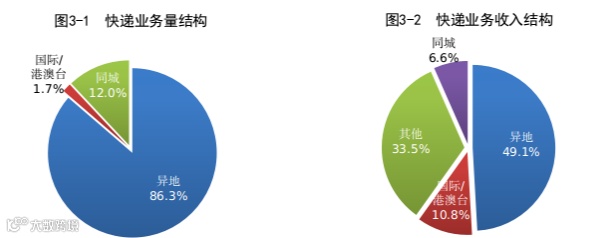 1-7月,同城、异地、国际/港澳台快递业务量分别占全部快递业务量的12.0%、86.3%和1.7%;业务收入分别占全部快递业务收入的6.6%、49.1%和10.8%。与去年同期相比,同城快递业务量的比重下降1.2个百分点,异地快递业务量的比重上升1.6个百分点,国际/港澳台业务量的比重下降0.4个百分点。