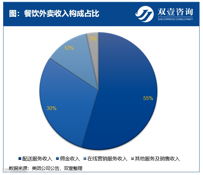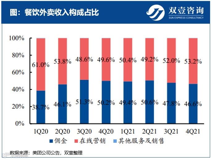 公司在2021年中开始,在商家端推行透明化费率方案,将收取的佣金分为“技术服务费用”和“配送服务费”。因此,2021年Q4公司餐饮外卖业务的收入构成主要由配送服务、佣金、在线营销服务、其他服务及销售4项构成。其中,在2021年Q4配送服务的收入占到了整个餐饮外卖业务收入的55%。