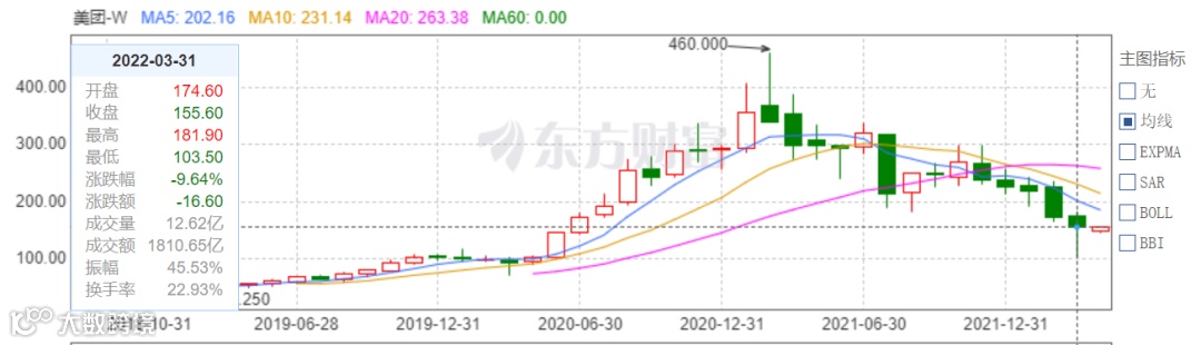 美团股价2021年以来跌跌不休,截至3月31日报155.6港元(126.22元人民币)/股,市值9470亿港元(7682.06亿元人民币)。2022年以来,美团股价已经下跌31%,由2021年12月31日的225.5港元(182.93元人民币)下跌至2022年3月31日的155.6港元(126.22元人民币)。