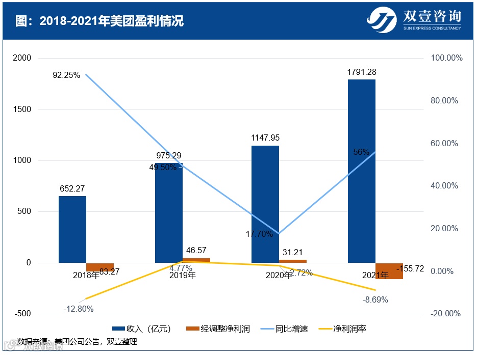 3月25日晚,美团发布2021年第四季度及全年财报显示,公司全年收入约1791亿元,同比增长56.0%,其中Q4收入495亿元,同比增长30.6%。但全年调整净利润额为-155.7亿元,两年后重回亏损状态,且是2018年亏损额的近两倍。另外,仅2021Q4的亏损39亿,就超过了2020年美团全年的净利润。