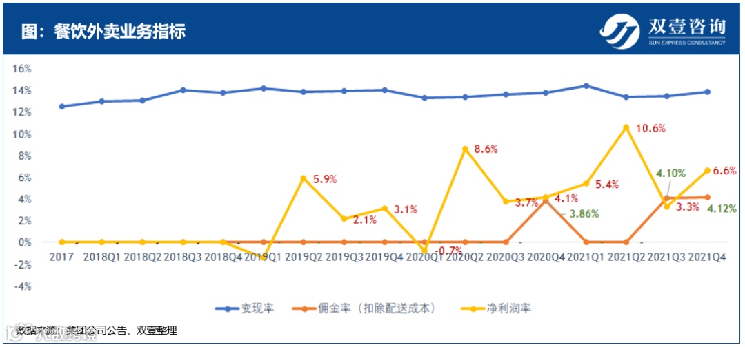 从数据上看,自2017年以来餐饮外卖业务(包含配送服务收入)的变现率一直保持13-14%左右,这其中的大概9-10个百分点都是配送服务费收入,扣除完配送服务收入后的真实佣金率实际只有4%左右。