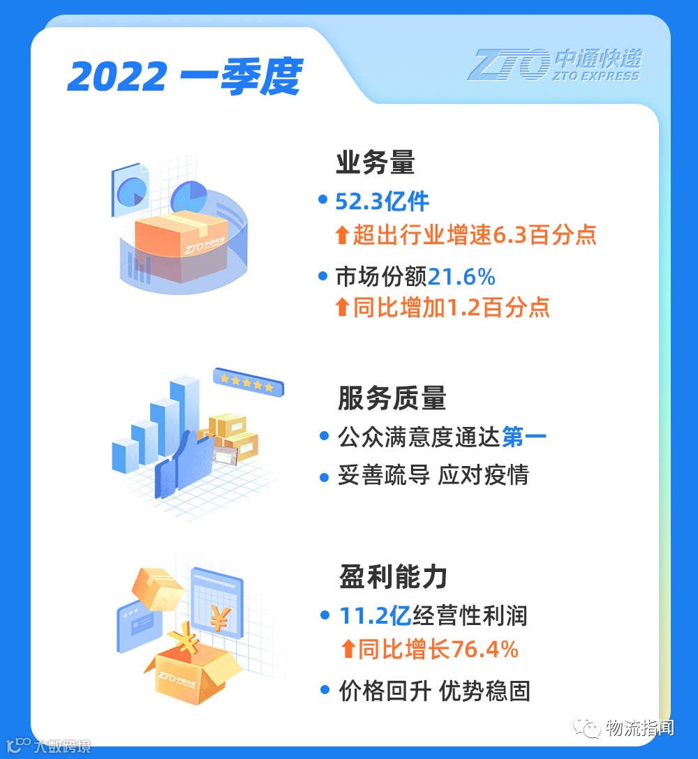 中通快递公布2022年第一季度业绩:市场份额扩大至21.6%,调整后净利润增至10.5亿元
