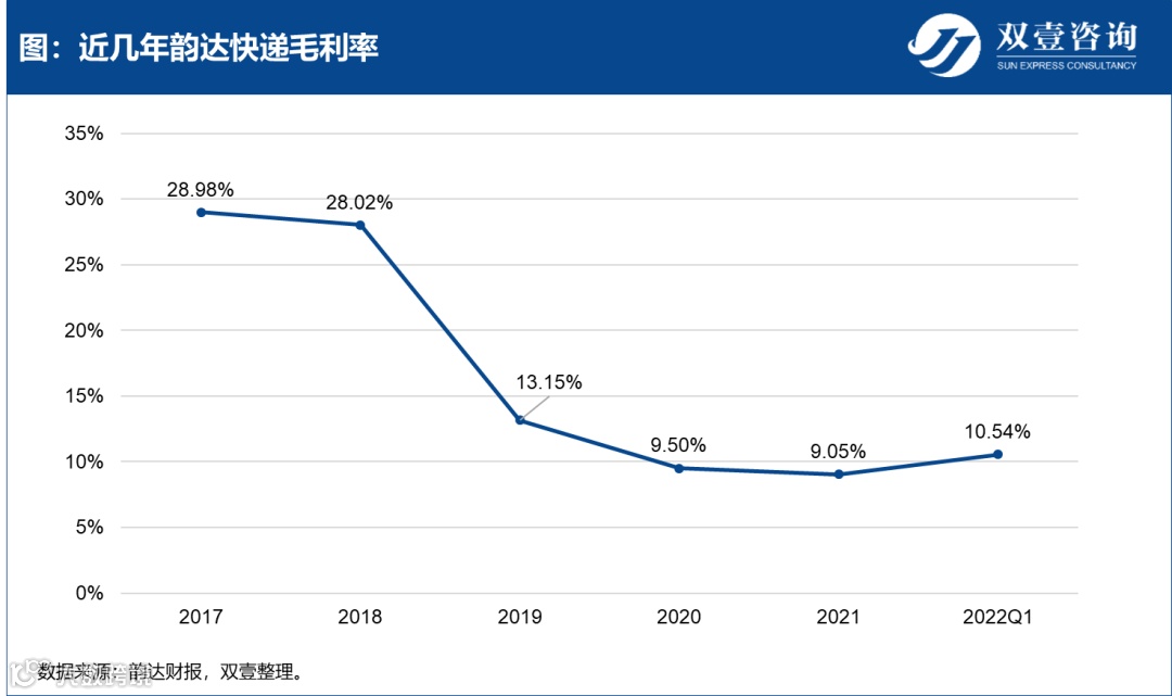 从2021年开始,在政策对快递行业的高压监管之下,恶性价格战得到遏制,单票价格持续回升。受益于此,韵达快递的单票价格从2021年二季度开始,呈现连续上升的态势。一季度虽有波动,但上升趋势不改。虽然单票价格在持续上涨,但这并没有让韵达的利润有大幅增长。据双壹调查了解,利润上涨速度变慢的原因可能在于三点:一是在2021年的价格波动,对利润产生了影响;二是营业成本中一些板块的成本上涨,导致利润再一次被挤压;三是韵达快递服务的网络由于价格的波动导致出现了一定的不稳定因素影响。