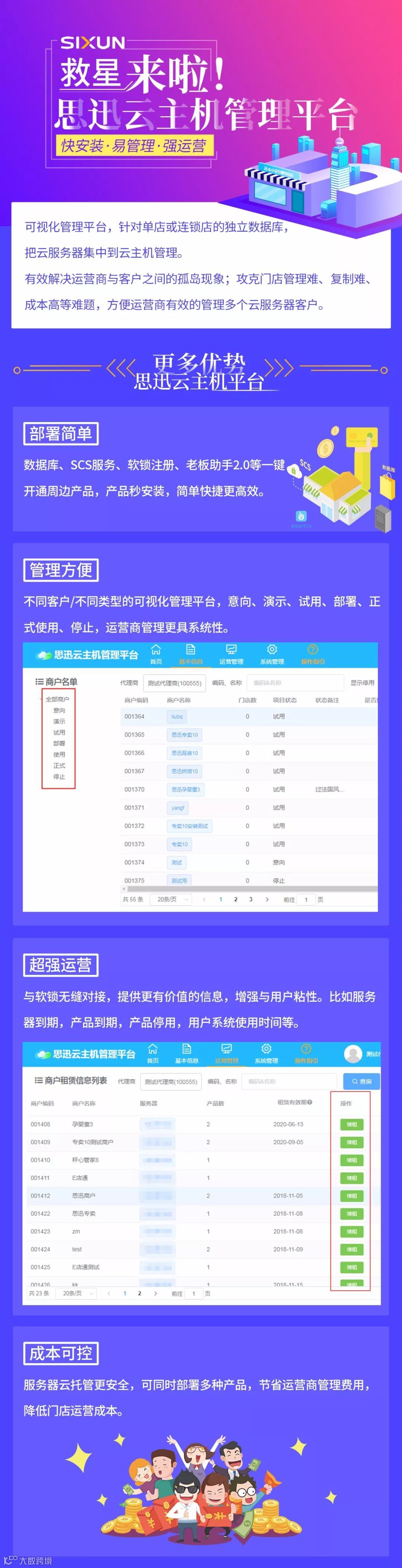思迅全家桶方案之云主机管理平台,客户-代理商-思迅紧密联系,真正的可视化管理平台,多个产品/服务器一个云平台轻松搞定,促进运营商的高效部署管理,商户更省心。