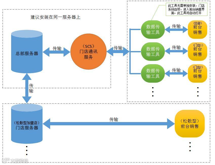 门店通讯服务(SCS)模块说明:总部及门店(不包括松散型加盟店)的前台销售数据通过门店的数据传输工具与门店通讯服务(SCS)进行数据交换,门店通讯服务(SCS)再将各门店上传的数据处理到数据库服务器中。若网络存在问题或总部SCS服务未启动,则无法进行数据交换。