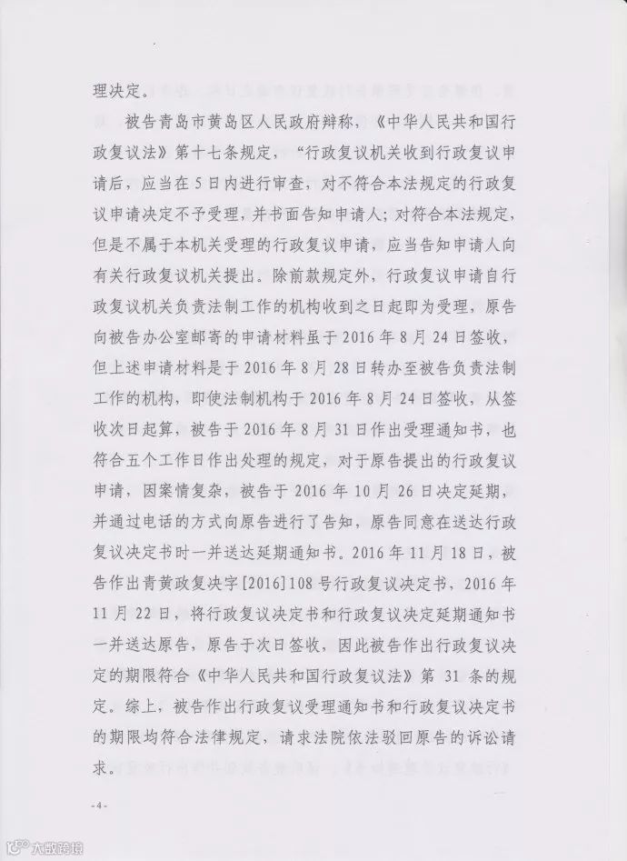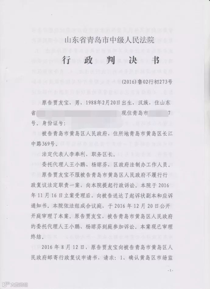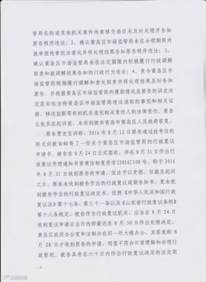 贾某投诉青岛市黄岛区政府行政复议不作为案中,青岛市黄岛区政府作出的行政的复议决定书,属于国家机关公文,应当严格按照法定要求和法定途径送达,但其违背邮政法等相关法律法规规定,采用顺丰快递方式送达政府机关公文,明显违背了国家法律的禁止性规定,具体行政行为明显不当。