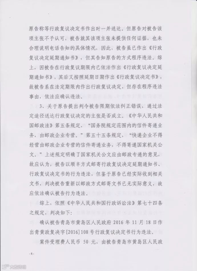 故法院同时确认其以顺丰快递方式邮寄行政复议延期通知书和行政复议决定书的行为违法。