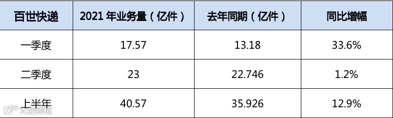 根据公开数据,百世快递2021年一季度包裹量达到17.57亿件,同比增长33.6%;二季度包裹量同比增幅明显回落,只有1.2%。