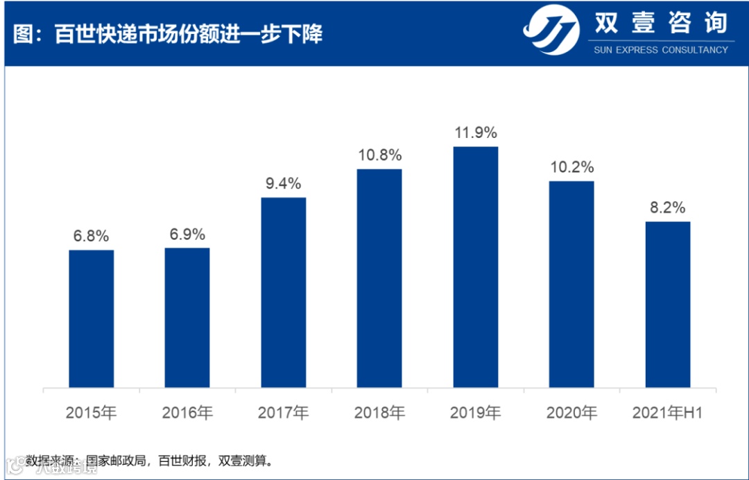 今年上半年,全国快递业务量累计完成493.9亿件,同比增长45.8%。百世快递业务量增幅明显落后于行业,上半年市场占有率进一步下滑到8.2%。