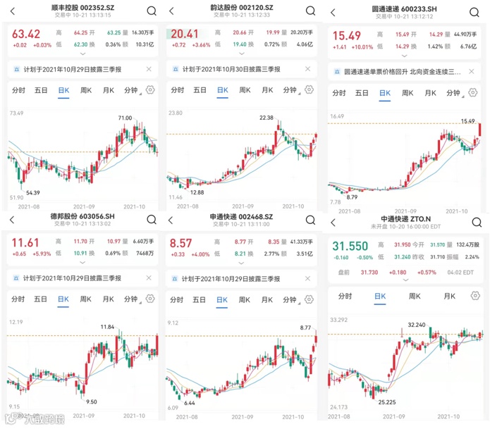 距离今年的双11还有20天左右,多家快递公司的股价实现大涨。截止到2021年10月21日13时13分,圆通和德邦的增长突出,申通、韵达、顺丰也实现了大涨。