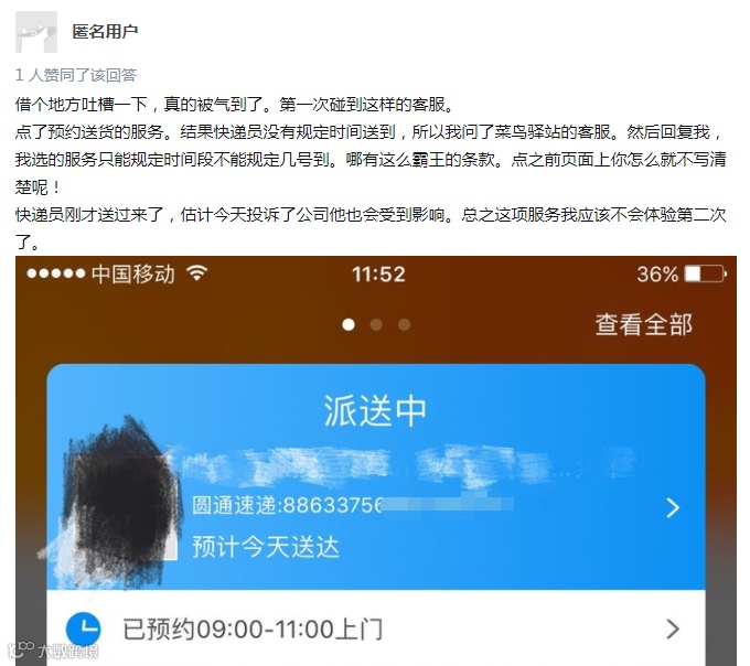 还有网友反映,菜鸟的这项服务只能规定时间段,不能规定具体日期。