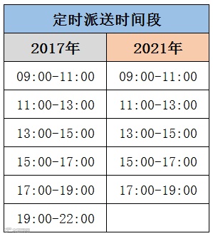 比起这次,当时的“定时派送”可选时间跨度更长,从早上9点一直到晚上10点。将一天分为六个时间段,每个时间段为两个小时。用户可以选择11:00-13:00派送,也可以选择19:00-22:00派送。