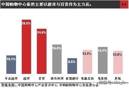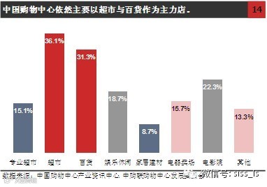 在《中国购物中心发展及预测报告2012-2013》的购物中心样本中,主力店主要以专业超市、超市、百货、电器专业店、影院和家居建材专业店为主。报告最新数据显示,主力店分布中以超市所占比例为最高,达到29.5%,报告认为选择超市作为主力店的购物中心占比接近三分之一,可以看出中国更多的购物中心具有典型的社区服务和区域性服务的特点。