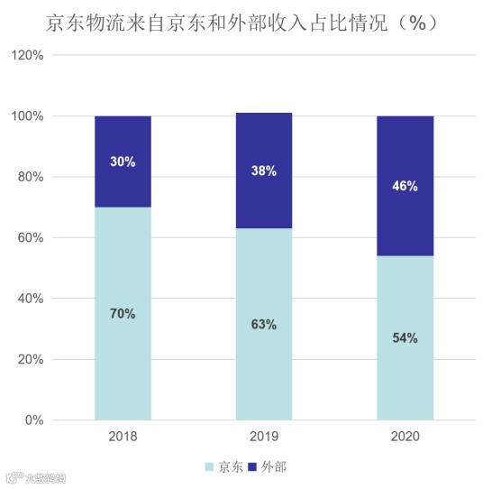 然而随着近几年对外开放战略的实施,京东物流外部客户收入占比已经从2018年的29.9%、2019年的38.4%增长至2020年的46.6%,增长可观。据京东物流公布,其2020年“一体化服务”外部用户5.3万,“一体化服务”的渗透率有很大提升空间。