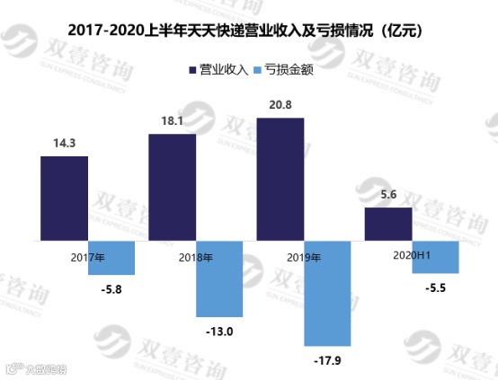 就苏宁易购历年财报披露的数据而言,2017年-2020上半年,天天快递连年亏损,三年半的时间里亏损金额超过42亿元。在快递行业残酷的价格战下,并不具备规模优势的天天快递盈利前景并不明朗。