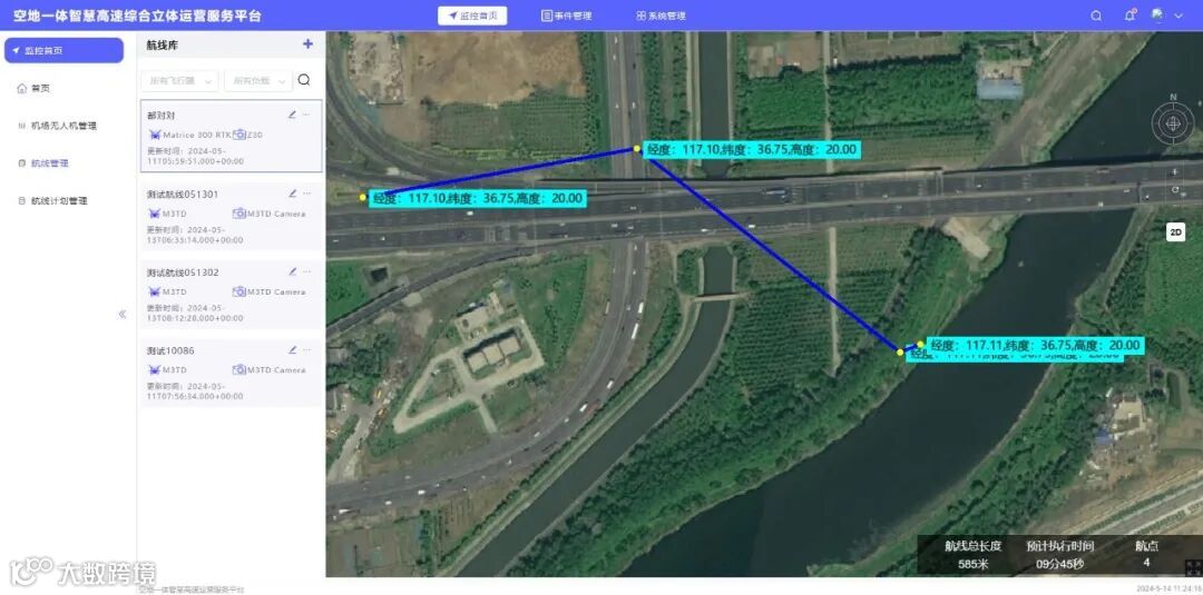 该平台主要解决桥梁及边坡巡检困难的问题,通过制定巡检路线及巡检任务,无人机可对桥梁及边坡等特殊地点进行自动巡检。