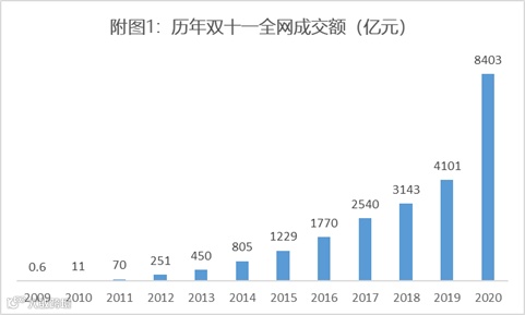 (注:网络公开数据整理,其中2020年数据为11.1-11.11全网销售数据和邮政局检测的快递包裹数量)