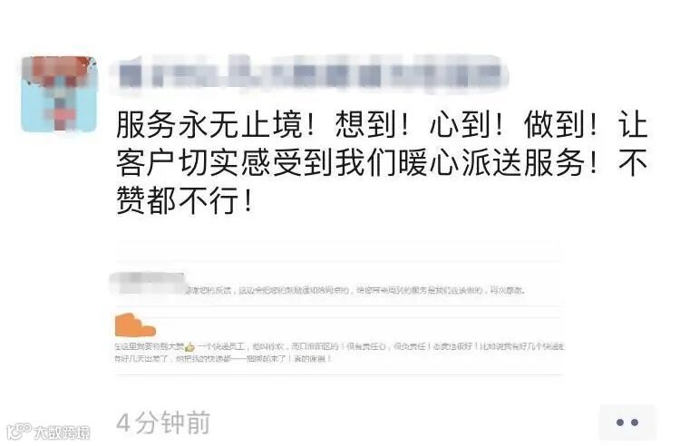 下图所示的网点便是将以客户为中心的服务理念贯彻到了业务员当中,通过业务员派件过程中的一个暖心细节,提高了客户对于派送服务的满意度,而这样的服务意识正是很多快递从业人员所缺少的。