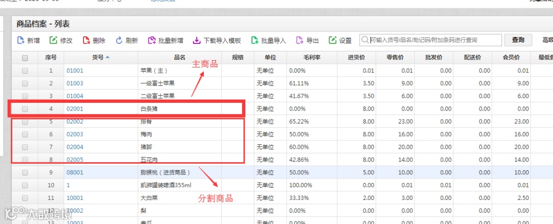 商品档案建立时主商品的【商品类型】选择为“自动转货”(管理库存),其余分割商品的商品类型为“普通商品”(不管理库存)。