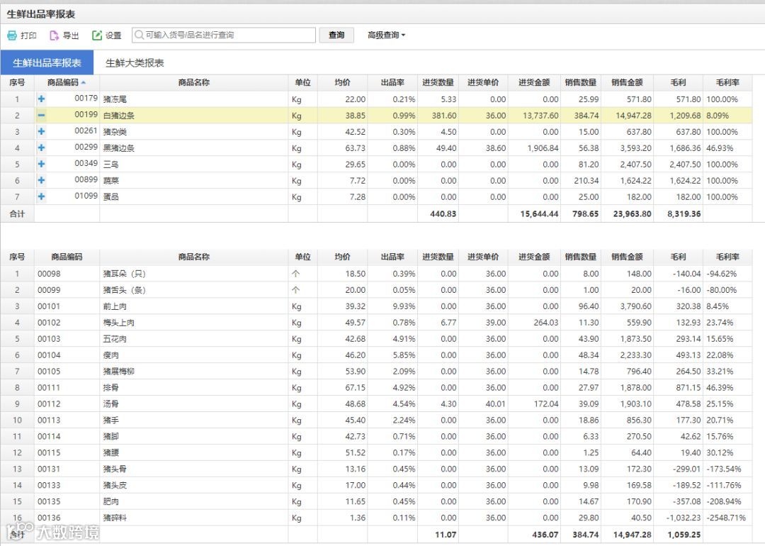 以肉类为代表的一类生鲜门店,刀手分割技术都可直接决定当天的利润,因此,分割销售不仅能帮助门店增加收益,同时通过天店收银系统后台生鲜出品率功能,门店也能清晰掌握整天的营业数据。