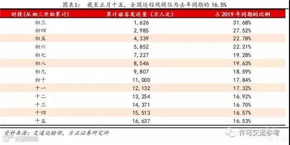 我们将正月初三界定为返程开始日期,2020年初三至十五,全国旅客发送总量为1.66亿人次,仅为去年同期(10.07亿人次)的16.5%。