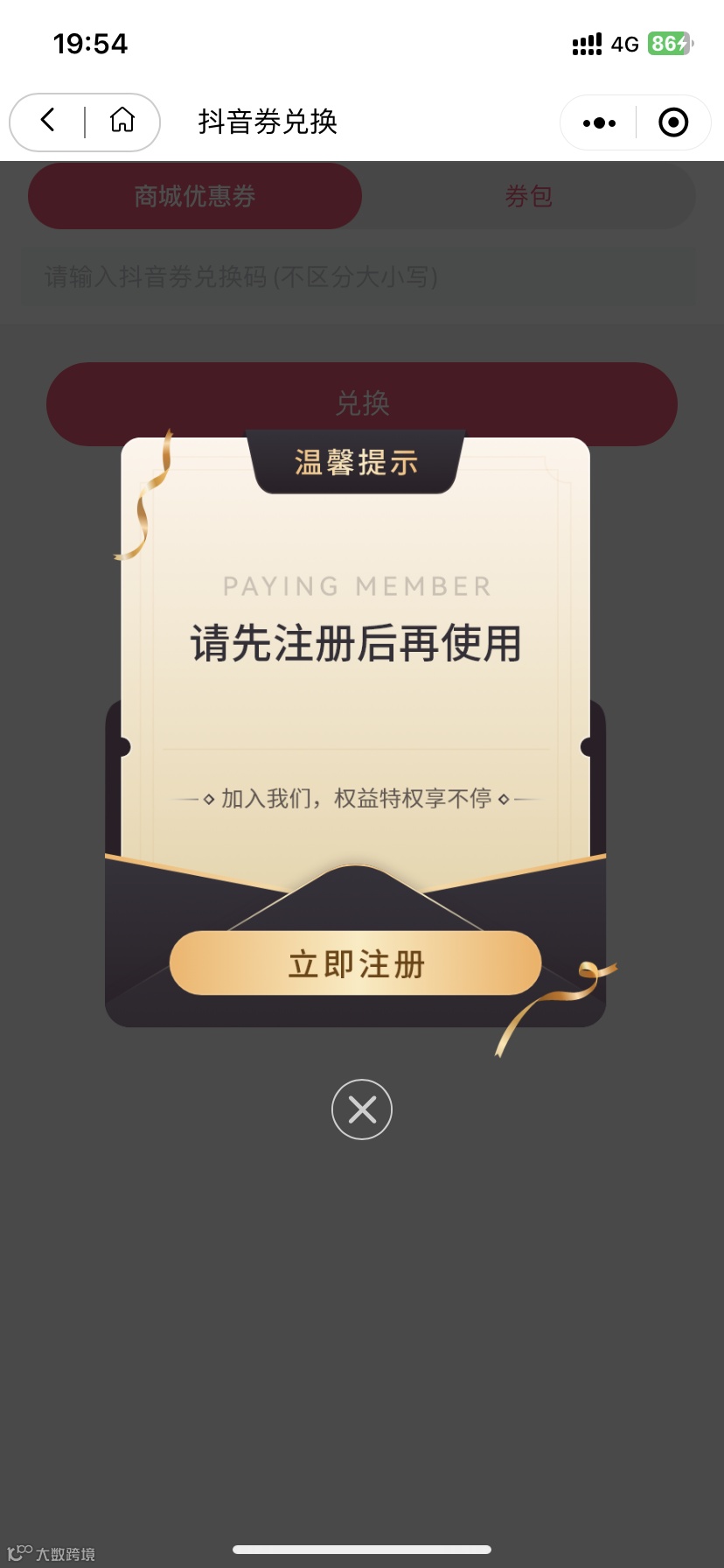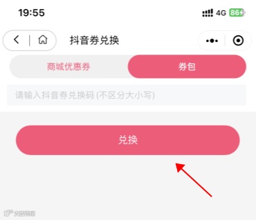 step4:选择“券包”粘贴抖音券码,点击“兑换”完成券包兑换。