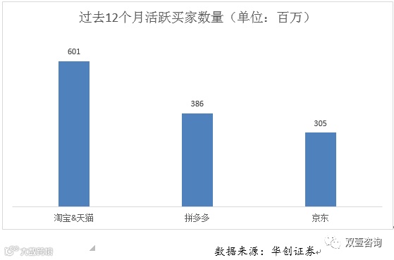 2018年之前,国内电商行业呈现阿里、京东双寡头竞争格局。随着拼多多的快速崛起这种格局正在快速被打破。根据华创证券2018Q4的统计数据来看,拼多多在过去12个月活跃买家用户数量为3.86亿的,京东的活跃用户买家数量为3.05亿,在过去12个月活跃买家数量上,拼多多已经完成了对京东的超越,且差距正在逐渐拉大。