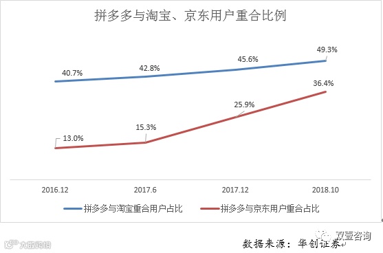反观电商另一巨头的拼多多,和快递寄递服务供应商合作较为松散,仅停留在业务合作层面,平台产生的包裹全部通过第三方快递公司寄递。主要的寄递服务由通达系快递企业提供,也就是阿里投资的快递企业为拼多多提供快递寄递服务。从淘宝和京东与拼多多的用户重合占比情况来看,显然拼多多和淘宝的用户重合比例更高,两者竞争关系更为激烈,由于拼多多的高速增长,未来对淘宝的威胁也更大。