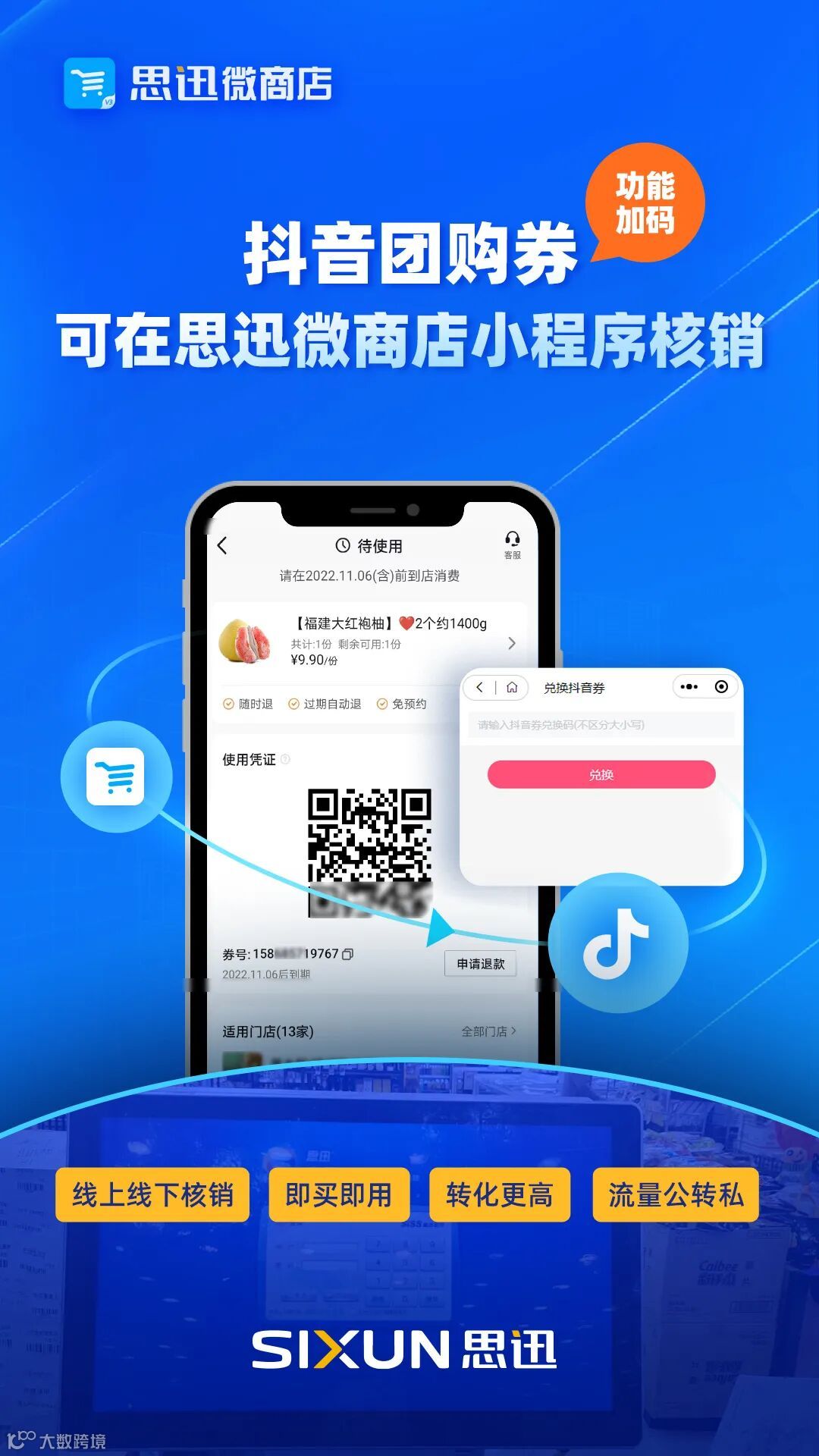 为实现抖音团购券线上线下场景核销,提升思迅商户在抖音生态成交力,思迅微商店抖音团购券功能再升级。