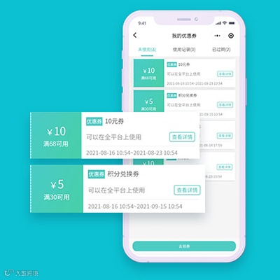 商家可将券放到小程序的领券中心里展示,让会员自助兑换,积分换券,兑换的券直接作为现金抵用。