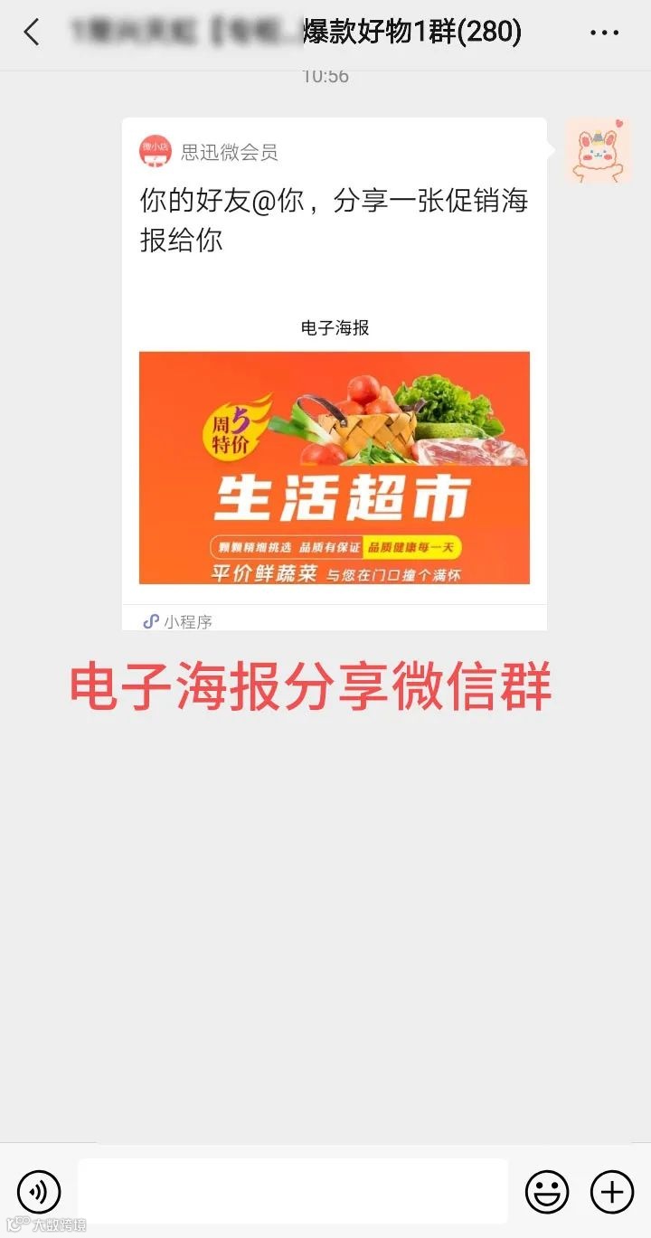 商家仅需把日常促销海报上传思迅微商店后台,顾客手机端即可浏览电子海报信息,电子海报支持一键分享朋友圈、微信群、微信好友,极大扩大活动宣传范围,提升活动触达率,且电子海报无需印刷,降低商家宣传成本!