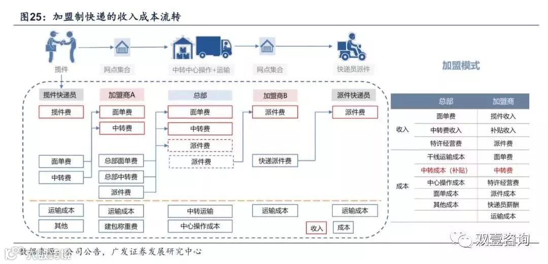 快递的加盟模式涉及加盟商和总部两个盈利主体,分别负责末端网点和干线中转,二者的利益平衡影响到全网的运营,其中,加盟商的利润水平影响末端的稳定性,进而影响全网的快递量。