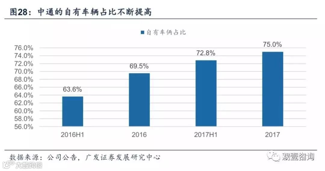 中转运输方面,三通一达都不同程度地采用了“自有+外包”相结合的模式,其中中通的外包比率最低。中通的自有车辆占比在60%以上,只有部分干线运输由桐庐通泽负责,而桐庐通泽只为中通一家服务,且中通部分员工拥有桐庐通泽76.6%的股权,两者互为相关方,因此中通的干线运输近乎自营。近年来,中通的自有车辆占比仍在不断提高。