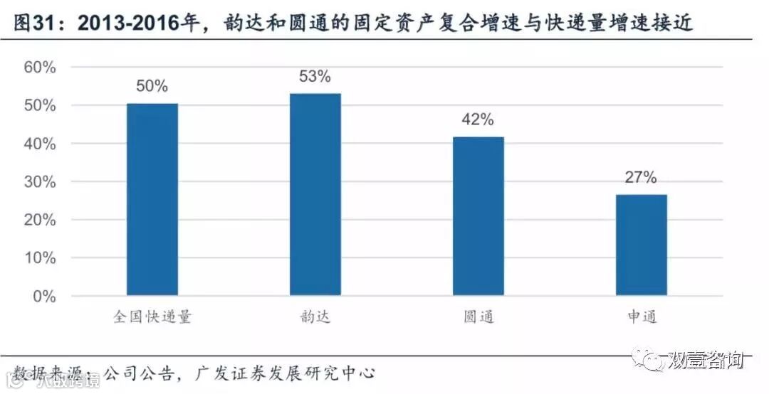 2013-2016年,韵达、圆通的固定资产复合增速分别为53%和42%,与全国快递量的复合增速较为接近。这使得韵达和圆通能够更好地满足市场需求的快速扩张,抓 住新增市场。