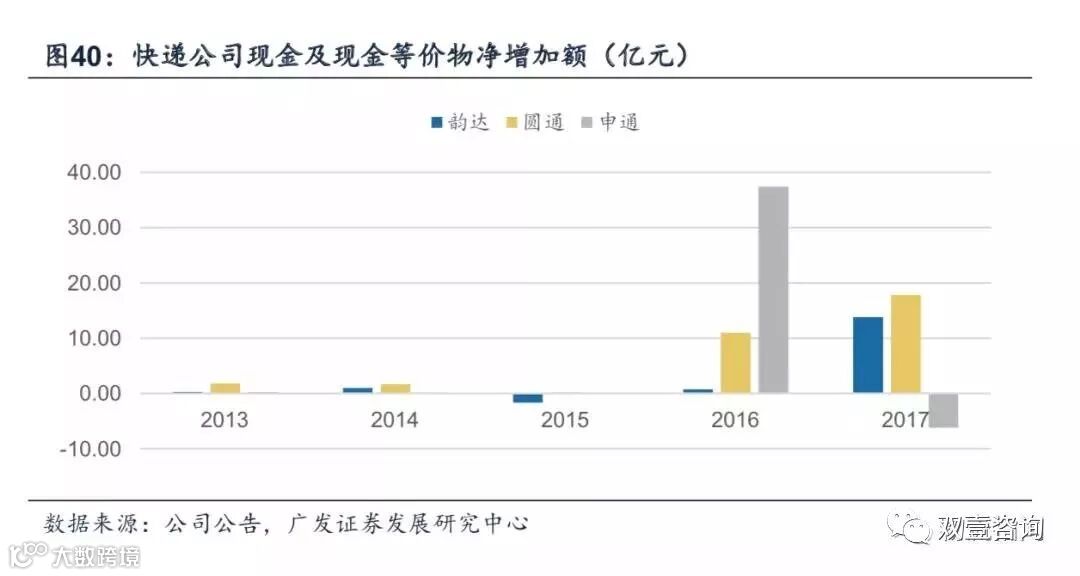 1.韵达的经营性净现金流最多,这一方面源于公司毛利水平较高,另一方面也得益于公司营运资本充裕,应收项和应付项都在扩大,这说明公司的经营规模确实在扩大,这也使得公司在没有上市配套融资的情况下也保证了的现金及现金等价物的增长;