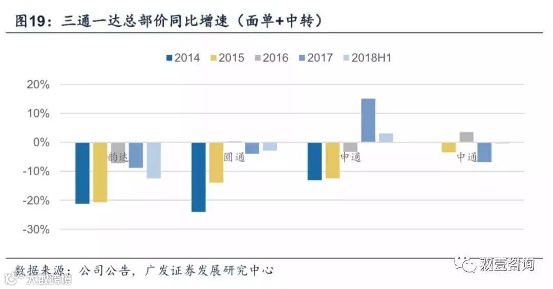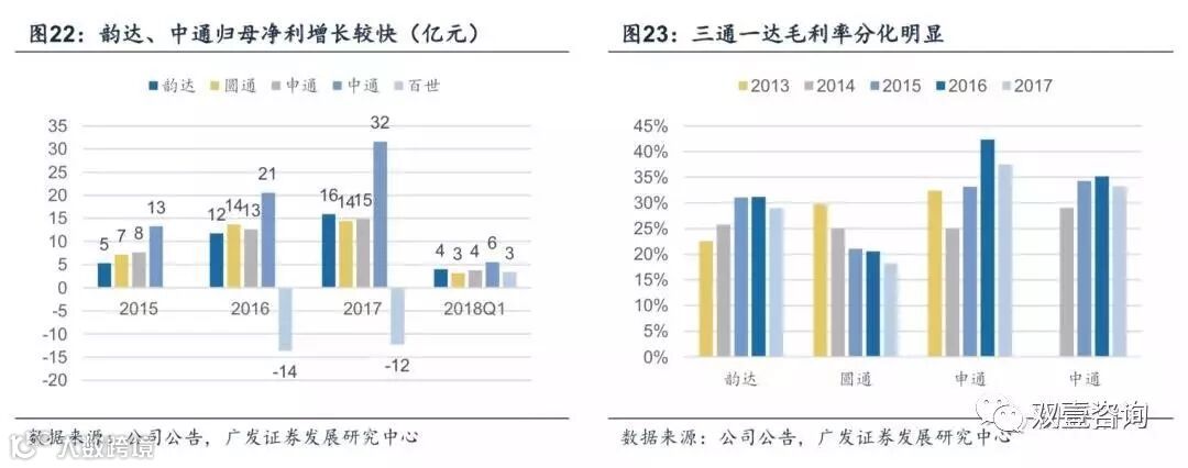 最后,我们计算了三通一达各自加盟商对总部的成本,其中,韵达=面单收入+ 中转收入+特许经营收入;圆通\申通=面单收入+中转收入+派送毛利(派送毛利为正则是加盟商的成本,派送毛利为负则是对加盟商的补贴);中通=快递业务收入。