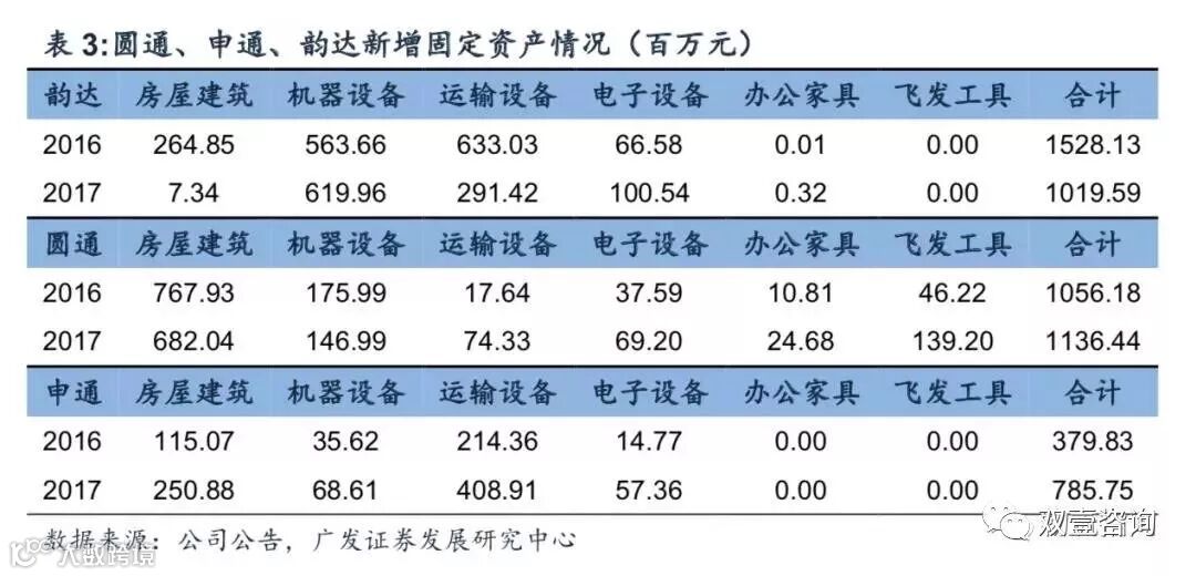 2017年,申通开始加快产能扩张,新增固定资产同比增长107%。截止2017年12月 31日,申通已经用于投资建设的配套资金为13.85亿元,甚至高于圆通的9.43亿元。从结构上看,申通的配套资金主要投向中转仓配和车辆设备的购置,未来有望看到产能扩张对申通单量增速的提振效应。