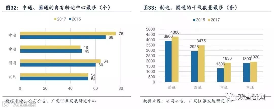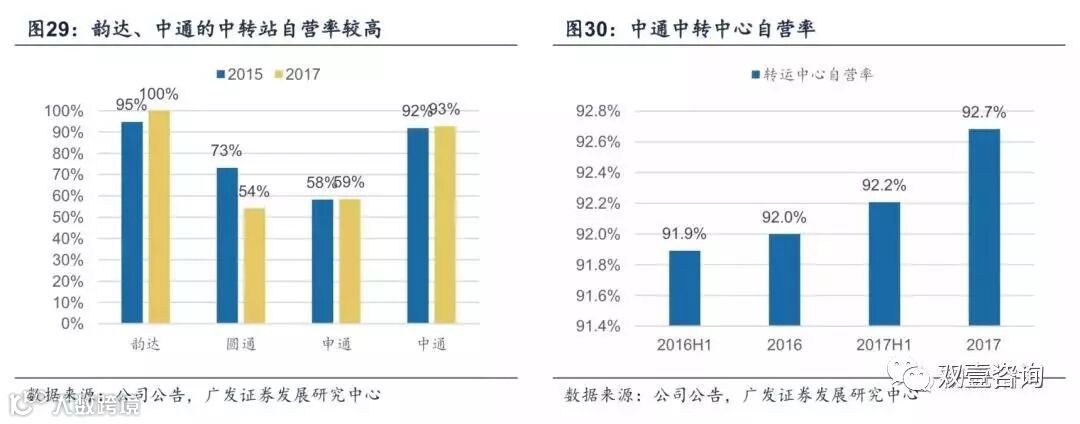 在中转中心方面,中通和韵达都采用了全直营的模式。