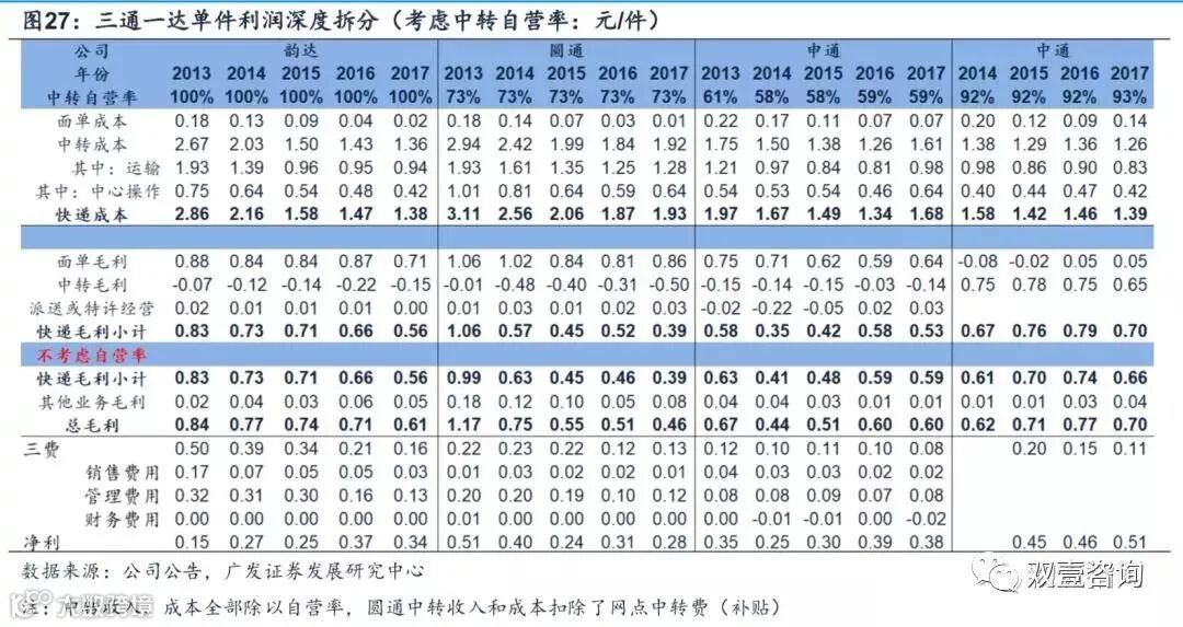 考虑到中转中心的自营率,我们对中转收入进行了调整,单件中转收入=中转收入/(单量/中转自营率);