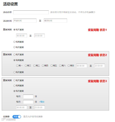 可按照每天,每周,每月设置活动重复周期,活动开始显示折扣价,过了时间自动恢复原价,后台创建一个活动可重复开启,提升活动运营效率。
