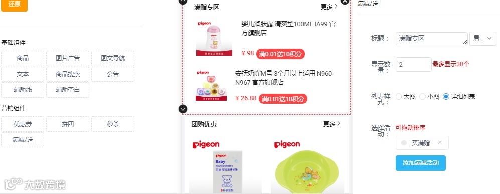 活动展示区:店铺黄金展示位,用户进店即可看到,信息最大程度曝光。可放拼团,秒杀,满减/送等活动列表,也可放店铺热销爆款产品及新上市产品。