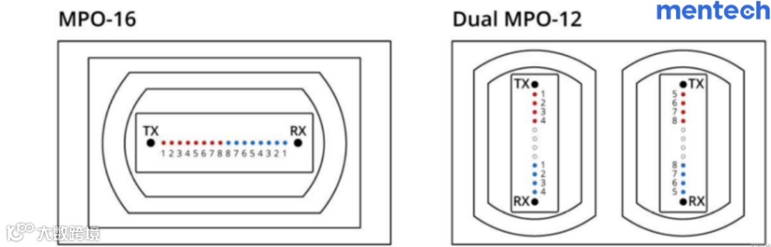 它采用VCSEL方案,波长为850nm,单通道速率为100Gbps PAM4,需要16根光纤。这可以看作是400G SR4的升级版本,通道数量增加了一倍。其光接口为MPO-16或2排MPO-12,如下图所示。800G SR8 光模块一般用于800G以太网、数据中心链路或800G-800G互连。