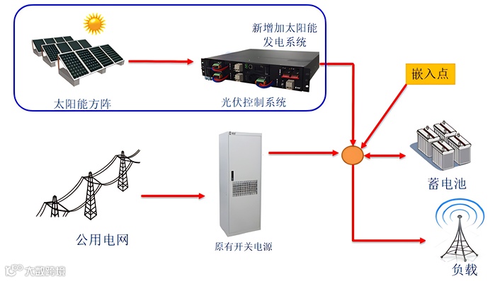 通信叠光系统主要分为直流输出与交流输出两种类型,而直流输出因深度匹配基站设备的直流负载特性(如主设备、传输设备等均采用-48V直流供电),成为当前主流应用。直流输出方案直接将光伏发出的电通过DC-DC转换为-48V直流电接入基站电源母排,相比交流输出类型的DC-AC-DC变换,减少了一个变换环节,降低了转换损耗。