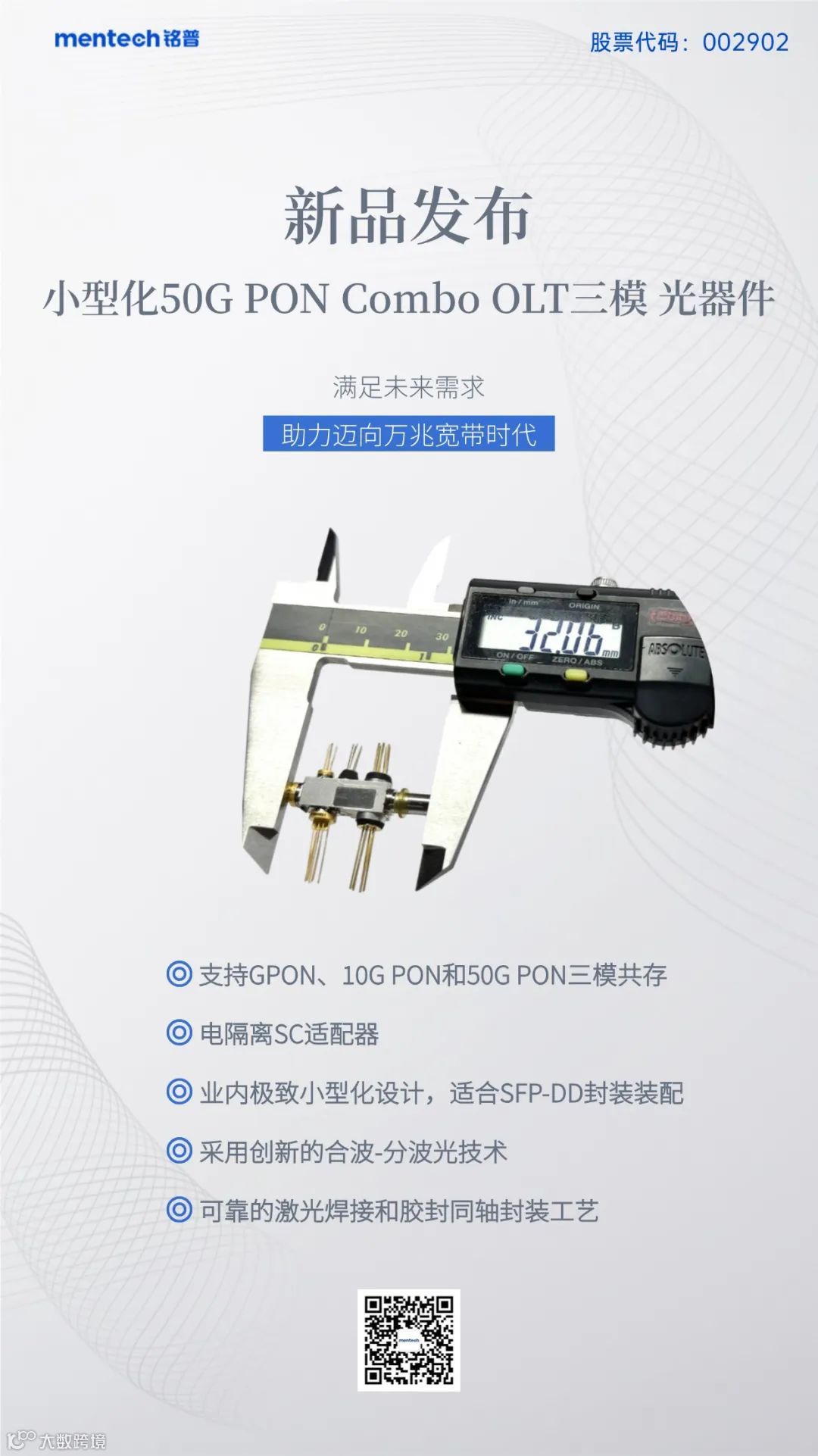 铭普多年来始终致力于光通信领域的研究,在光电器件和模块的研发与生产制造方面取得了显著进展,成功研发出小型化,同轴工艺的50G PON Combo OLT三模光器件,解决50G PON发展中的一项关键技术。