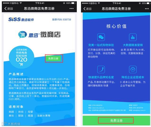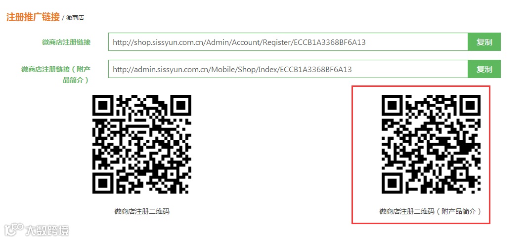 点击进入即可查看注册推广链接地址及手机注册二维码(以微商城为例)