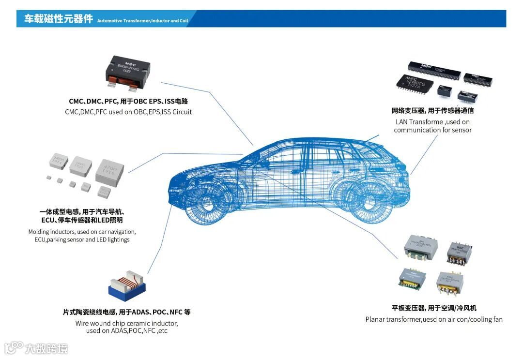 铭普光磁的一体成型电感应用范围广,除了应用于电脑、移动手机、电源、服务器等等多种领域,还应用在新能源电动汽车上,作为汽车电子发展的核心元件之一,被广泛用于汽车导航、BMS、ECU、停车传感器和LED照明。目前在批量供货给国内某著名整车厂。