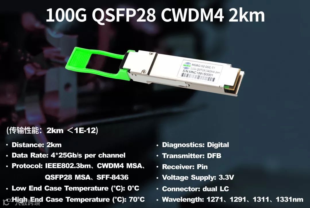 相对于目前市面上已有的100G CWDM4产品,我司最新推出的100G CWDM4 2km产品通过非气密COB工艺和领先于业界的器件国产化率,获得了当前最佳性价比。也为统一数据中心机房内部2km内的100G接口互联,提供了统一编码,单端可换的单模光纤解决方案。