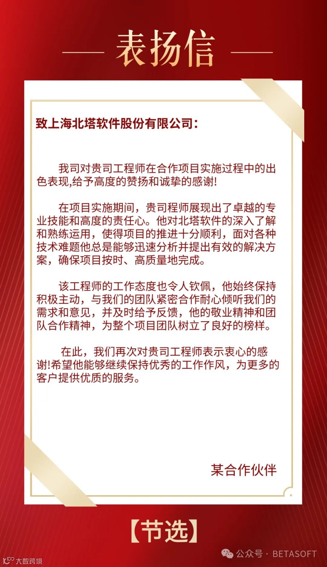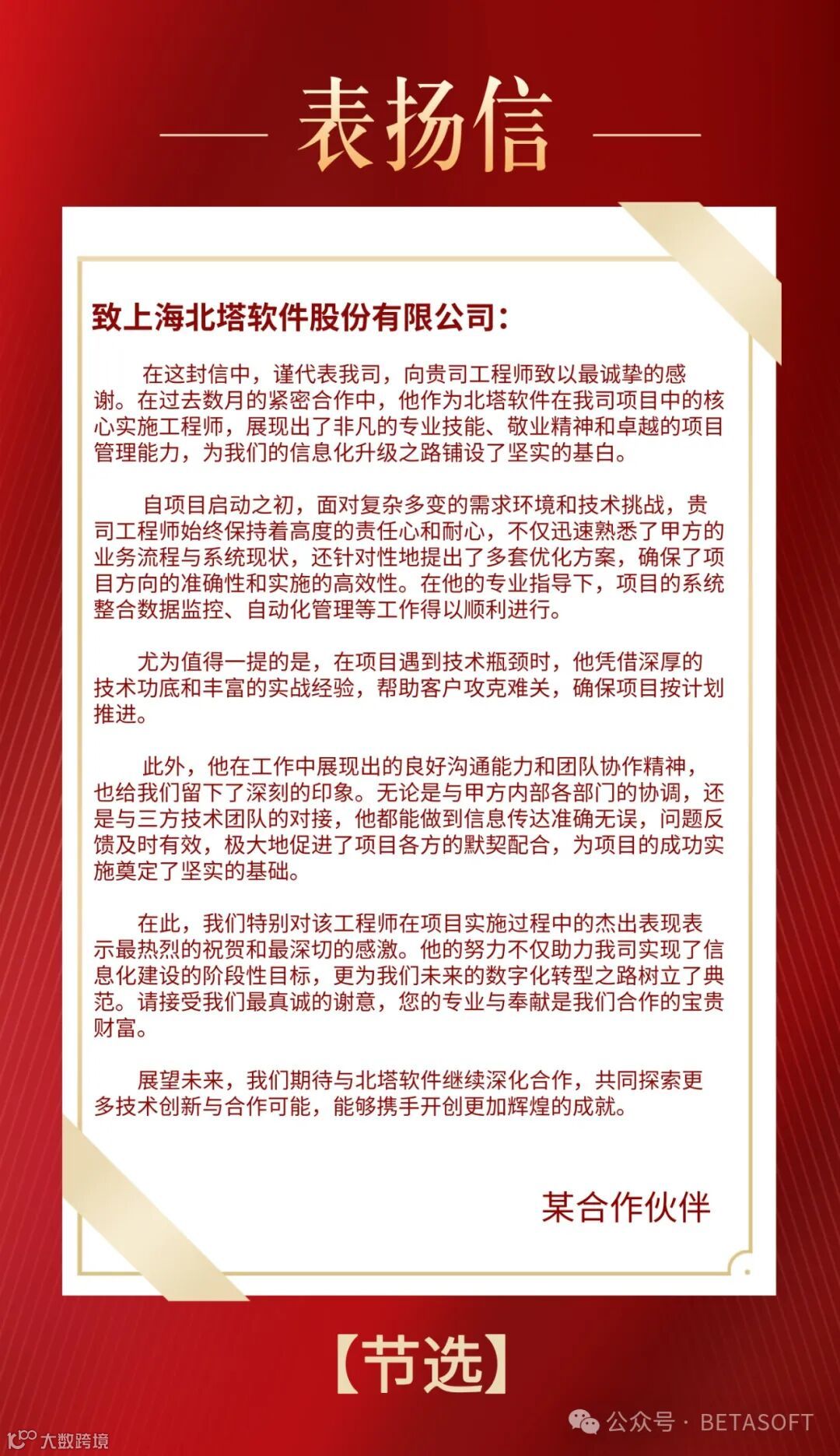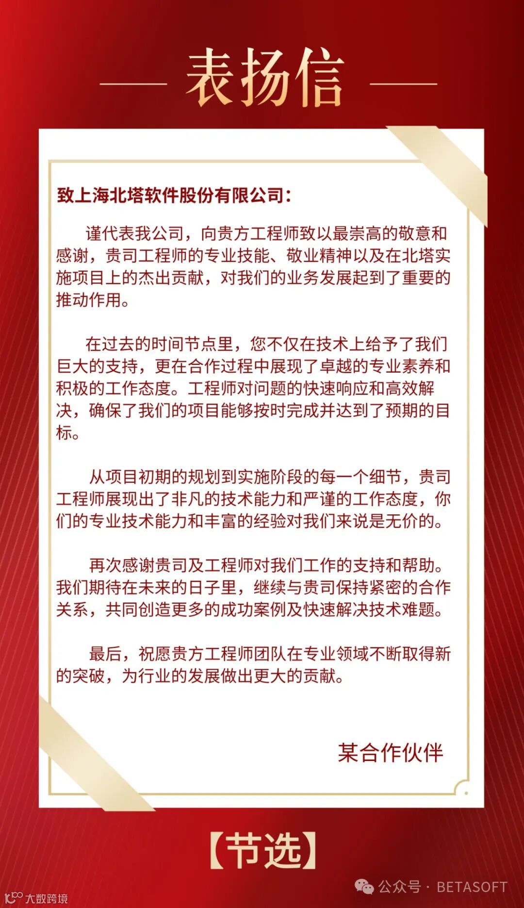 信中不仅对北塔软件工程师团队二十年如一日的服务精神和专业的技术能力给予了高度赞扬,更彰显了北塔软件与合作伙伴之间紧密互助、相互支持的深厚友谊。